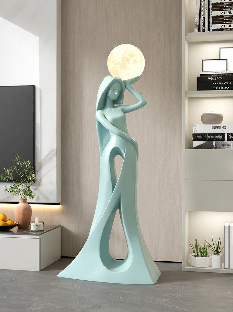 Contemporary Abstract Sculpture Design: Elegant flowing female figure in sophisticated teal finish creates stunning focal point while the moon-orb LED light adds celestial ambiance.