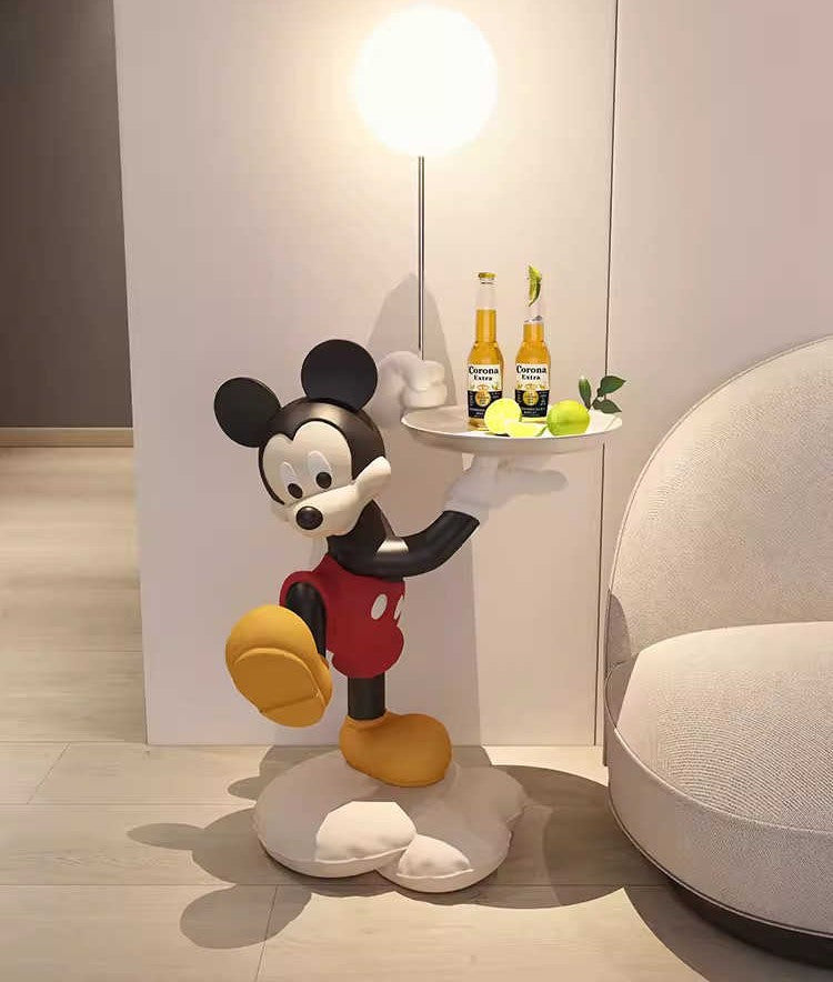 Make a bold statement with this extraordinary large Mickey Mouse floor side table, expertly crafted to serve as both functional furniture and captivating art piece. Standing an impressive 49.6 inches tall with a 24.8 by 24.4-inch footprint, this life-sized Mickey sculpture features the beloved character holding a spacious serving tray while supporting an elegant LED light sphere. The premium resin construction showcases Mickey's classic red shorts, yellow shoes, and black body with museum-quality detail and finish, ensuring lasting beauty in any interior setting. The integrated LED lighting system provides warm ambient illumination, transforming this piece from daytime décor into evening mood lighting. Perfect for placement beside sofas, in entryways, or as a unique dining room accent, this Mickey side table combines nostalgic charm with sophisticated functionality—making it an ideal luxury gift for new homeowners or Disney collectors who appreciate exceptional design.