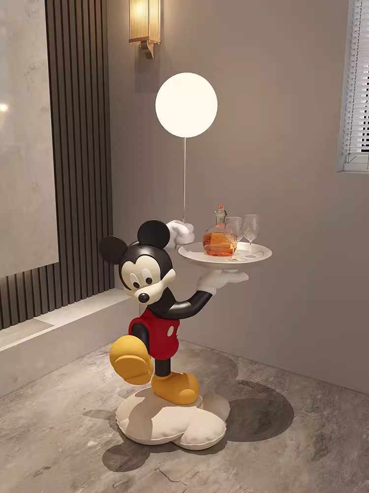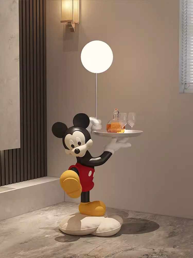Life-sized Mickey Mouse floor sculpture with functional serving tray and integrated LED sphere light, combining iconic character design with premium home décor.