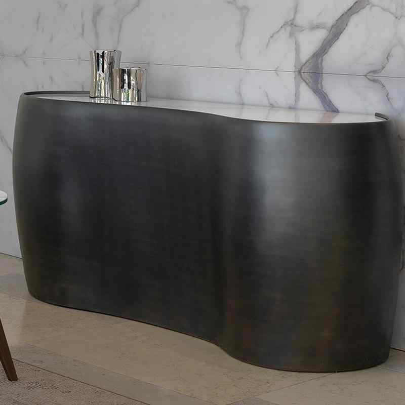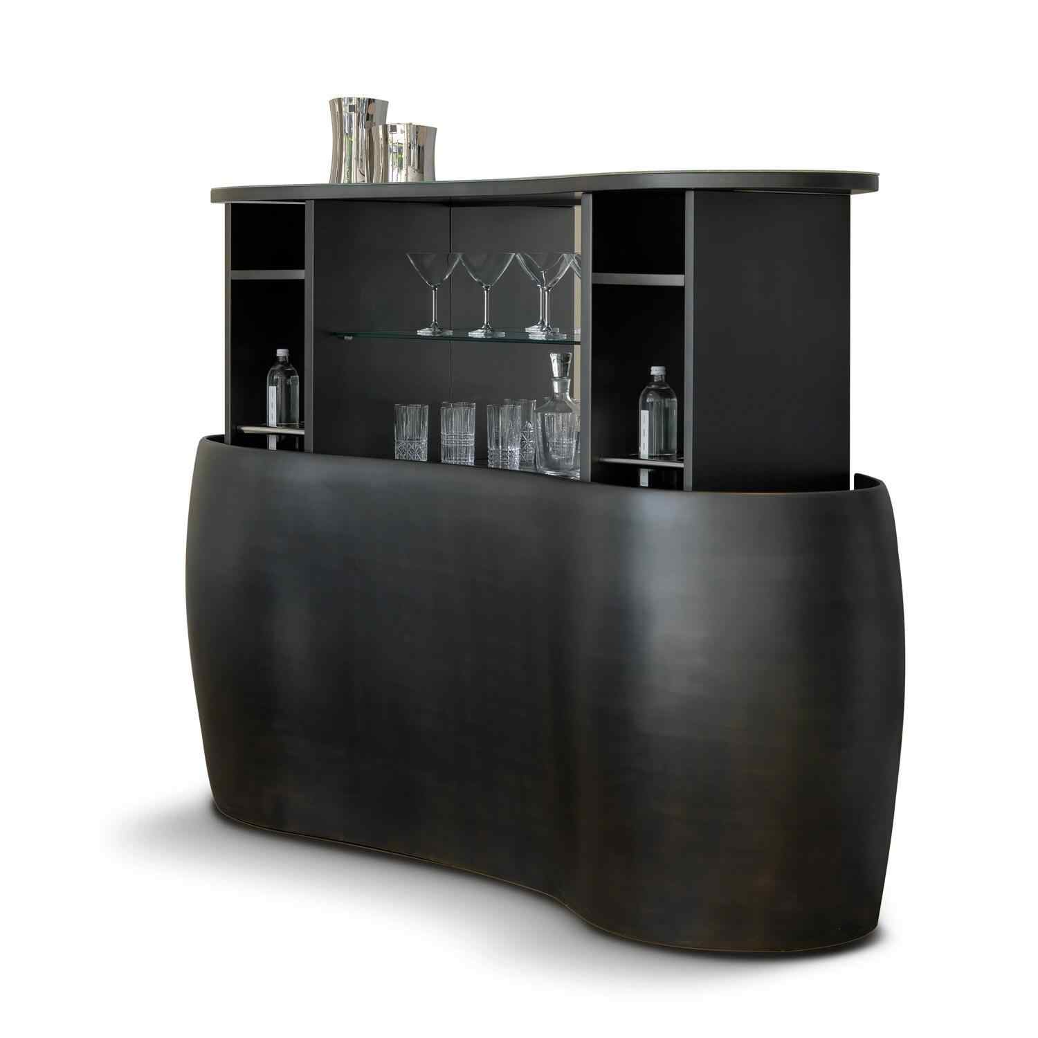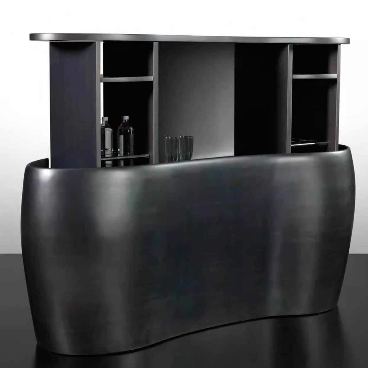 Professional bar counter height provides comfortable service area while sculptural silhouette serves as architectural statement piece.