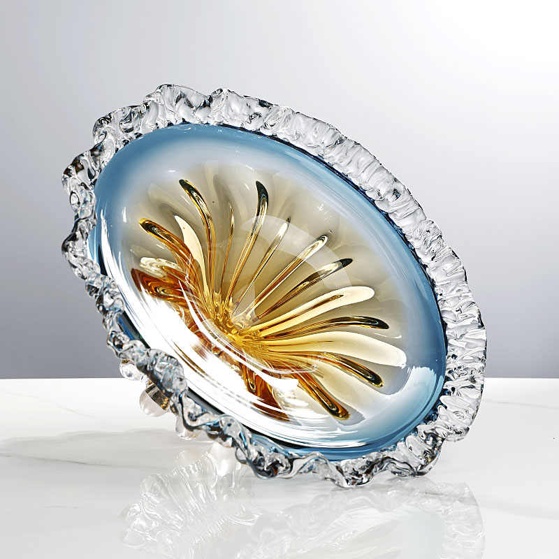 Premium pressed glass construction with flowing color transitions from ocean blue rim through amber to golden center showcases exceptional artistry.
