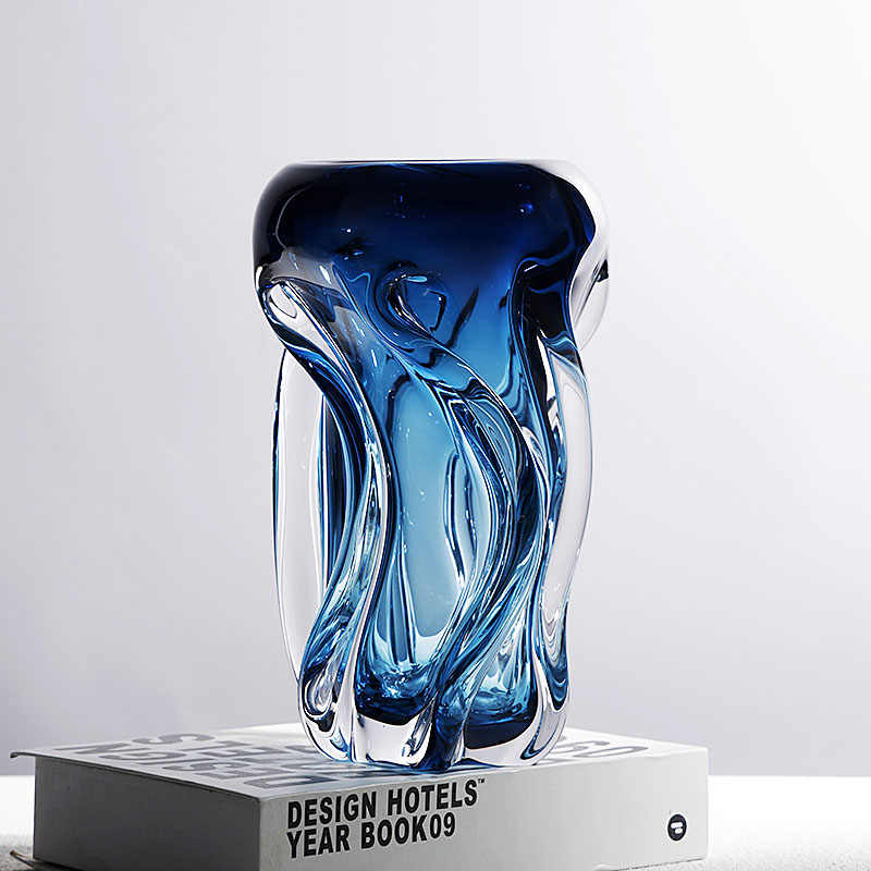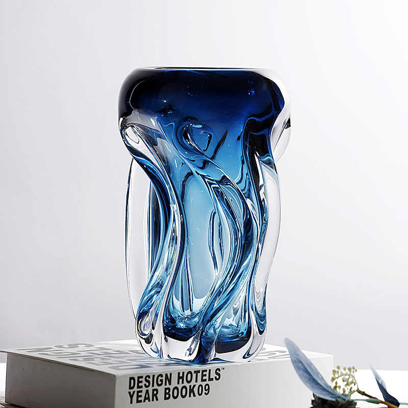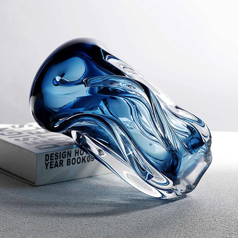 Transform your living space with this Luxury Blue Art Glass Vase, a sculptural masterpiece blending minimalist design with bold color and elegant form. Standing 30cm tall, this vessel is expertly hand-blown from premium crystal glass and showcases a hypnotic blue gradient that transitions seamlessly to clear, catching and refracting light with every curve.