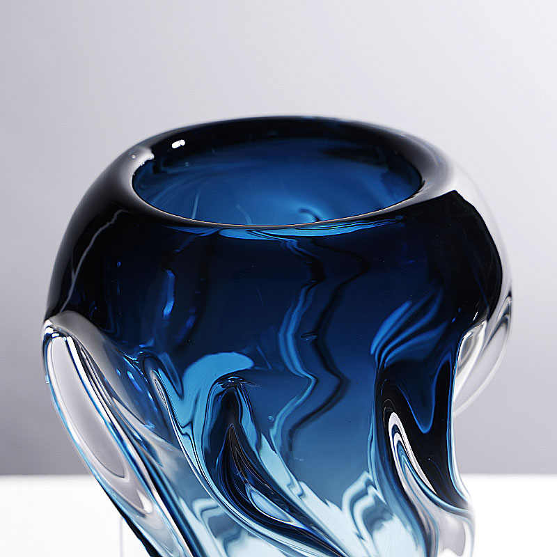 Elegant luxury blue art glass vase featuring organic, sculptural flowing lines and a mesmerizing gradient from deep sapphire to crystal clear.
