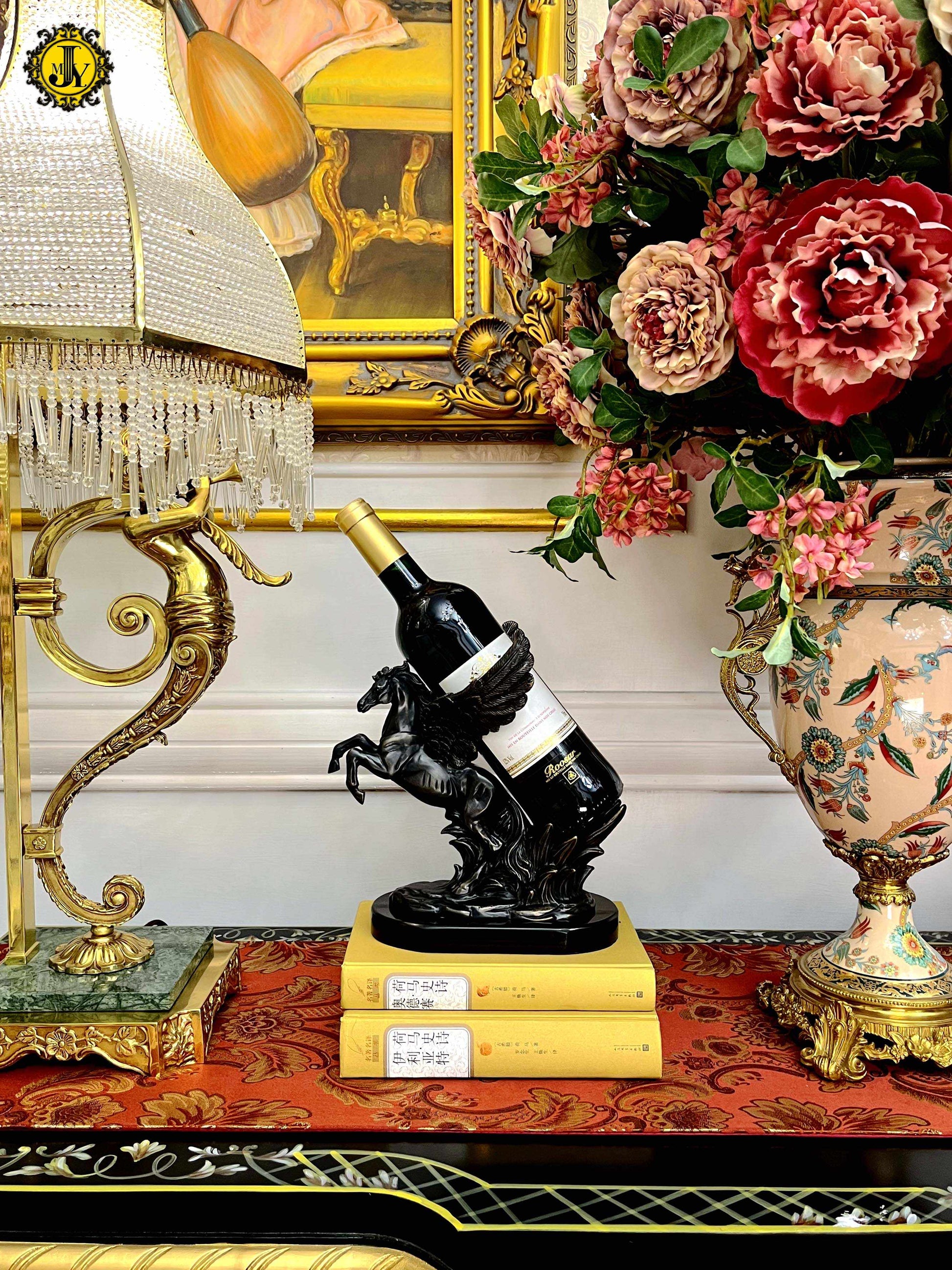 Exquisite manor-style wine rack features a flying Pegasus sculpted from heavy black bronze and set on a marble base, embodying both strength and artistic flair.