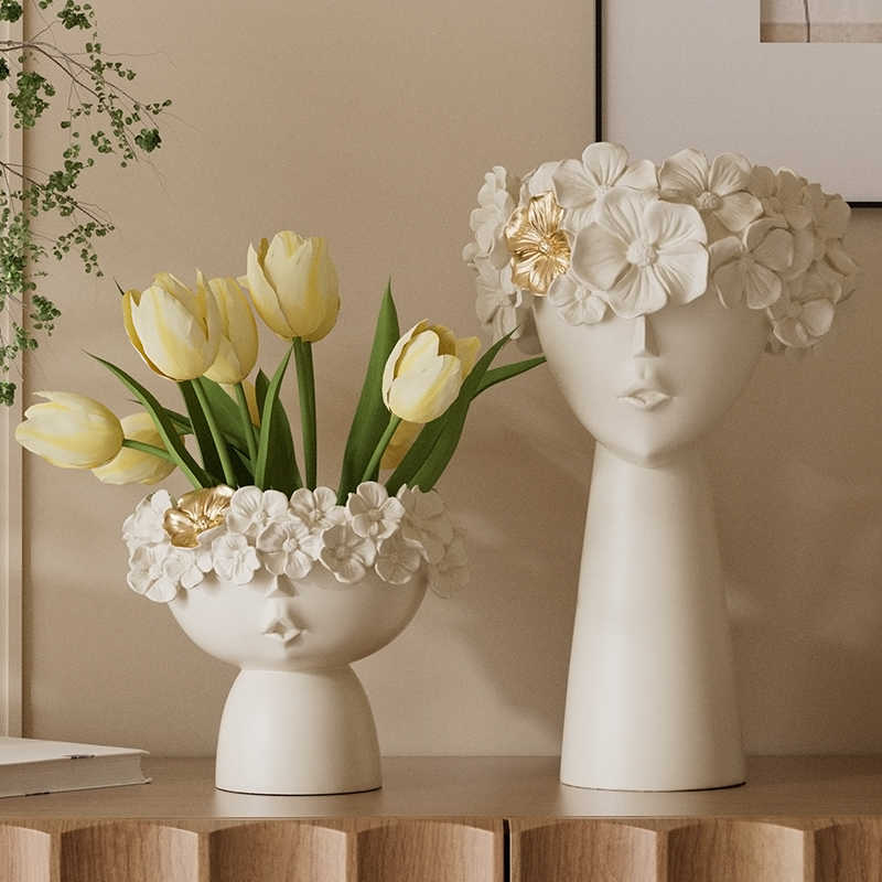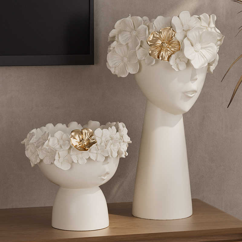 Transform living spaces with this Luxury Ceramic Head Sculpture Vase Set, where contemporary artistry meets functional elegance in sophisticated home décor. The collection features two beautifully proportioned ceramic head sculptures—a tall 11.6-inch piece and a complementary 5.5-inch version—each crowned with an enchanting arrangement of handcrafted ceramic flowers. The pristine matte white finish showcases refined facial features while the dramatic floral crowns combine pure white ceramic blooms with striking gold metallic accents that catch and reflect light beautifully. These versatile pieces serve multiple purposes, functioning as statement sculptures, unique planters for air plants or succulents, or elegant holders for dried botanicals and decorative stems. Perfect for modern luxury homes, upscale offices, or boutique retail spaces, this sculptural duo brings artistic sophistication to entertainment centers, bookshelves, or dining tables while creating compelling conversation pieces that celebrate the intersection of fine art and functional design.