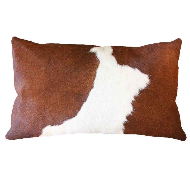 Single-sided design showcases beautiful natural cowhide on front with coordinating fabric backing for comfortable use against furniture.