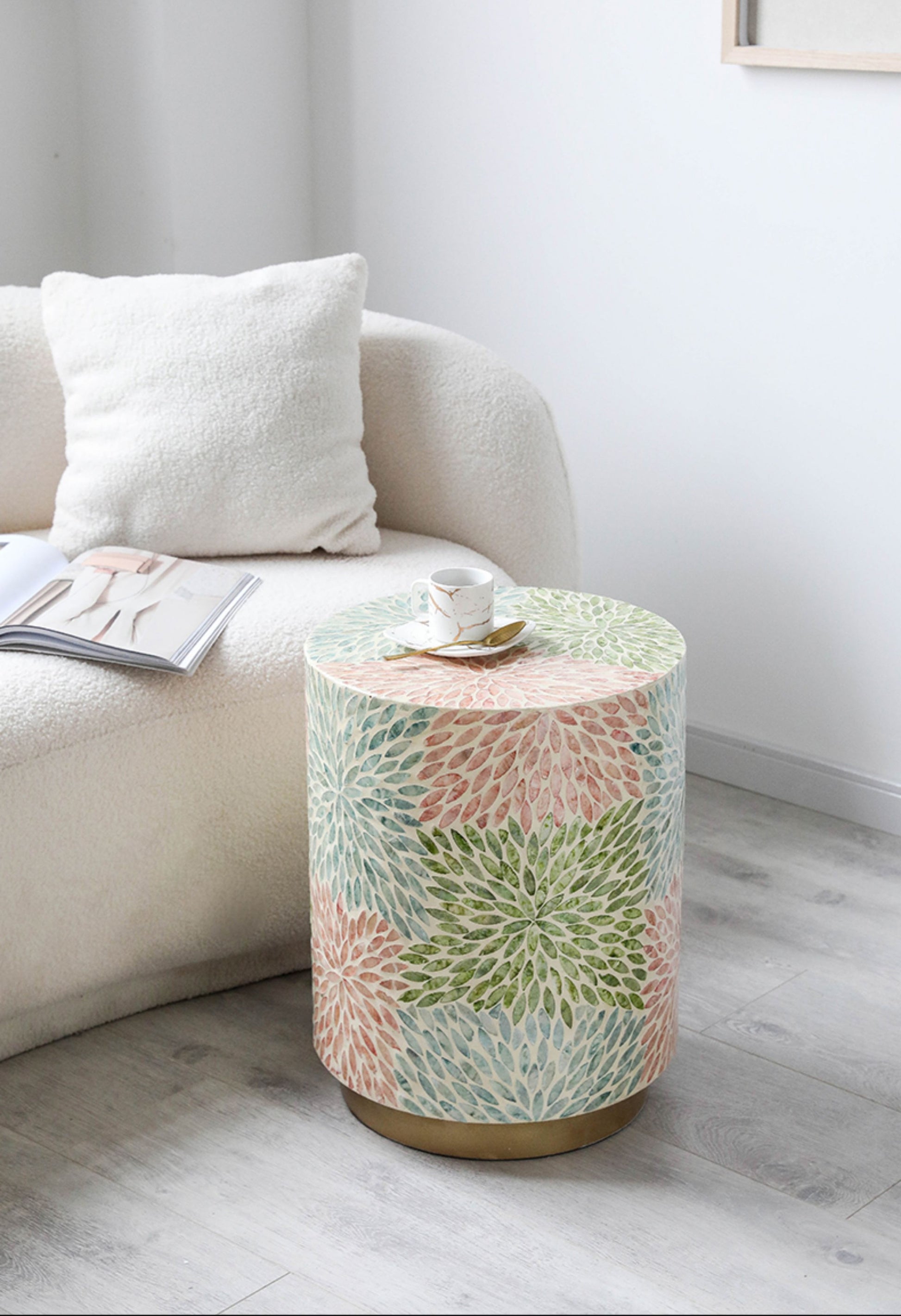 Artistic side table or stool features pastel mosaic in large flower burst pattern—hand-inlaid for unique luxury effect.