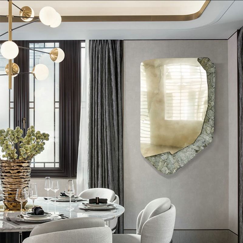 Striking mixed-material design blends abstract geometry and metallic texture, instantly elevating upscale dining rooms, living areas, or hotels.