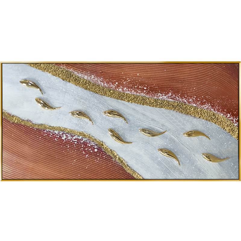 Elevate any living space with this luxurious Nine Koi Fish hand-painted oil painting, designed for those who value the powerful symbolism of prosperity, luck, and abundance in traditional Feng Shui. Measuring a generous 47 x 24 inches, this striking horizontal artwork features nine golden koi swimming against textured sand and a wave-like abstract background in rich red and gold hues. The sculpture-quality surface combines thick, hand-crafted brushwork with metallic accents for a truly dimensional effect. Professionally set in a black aluminum frame, the artwork brings both modern elegance and auspicious meaning to living rooms, sofa walls, or corporate reception areas. Painted with eco-friendly materials and skilled technique, the piece guarantees enduring beauty and a bold centerpiece that attracts good fortune and positive ambiance. Ideal for collectors, business owners, or anyone seeking a blend of artistic luxury and powerful symbolism in wall decor.