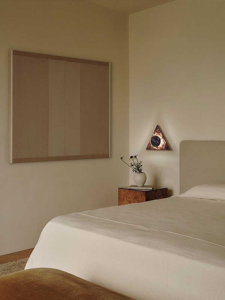 Modern Geometric Design: Striking triangular shape with integrated circular accent creates sophisticated contemporary wall art and lighting.