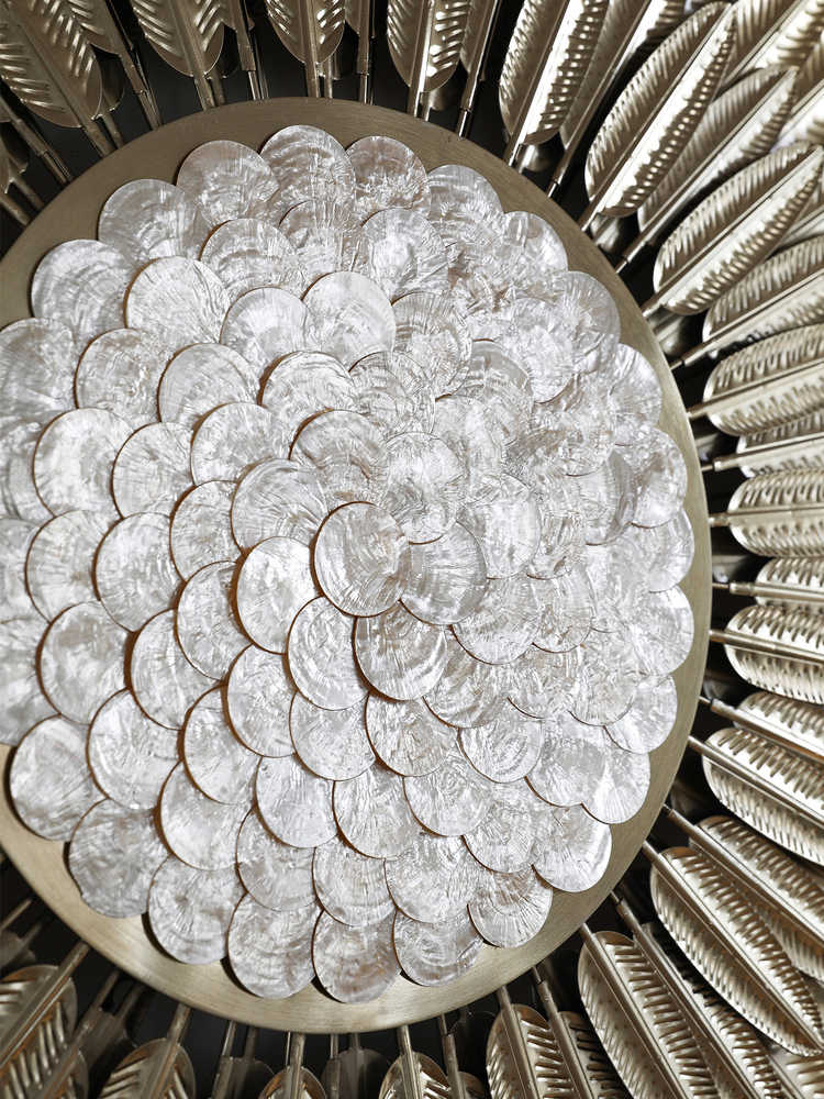 Opulent neoclassical feather-inspired design with rows of gold metal leaves surrounding a handcrafted mother-of-pearl center.