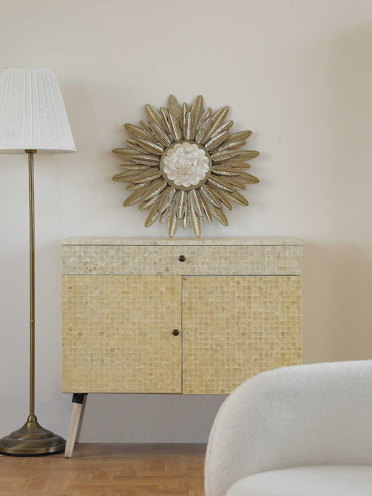 Enrich modern and classic interiors with this lavish neoclassical wall art, measuring 31.5 inches wide with an impressive feather motif radiating from a shimmering center. Precision-crafted from sturdy gold-toned metal, each feather is meticulously finished for lifelike depth and opulent shine. The capiz shell centerpiece reflects ambient light and adds visual intrigue, perfect as a focal point above sofas, mantels, or entryway consoles. Lightweight yet durable, this piece comes ready to hang for instant sophistication.