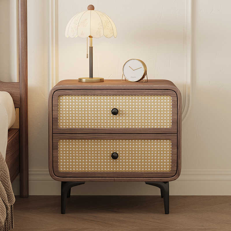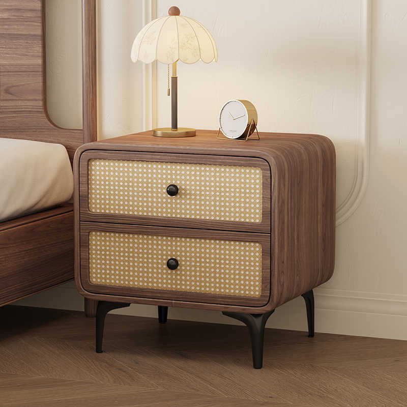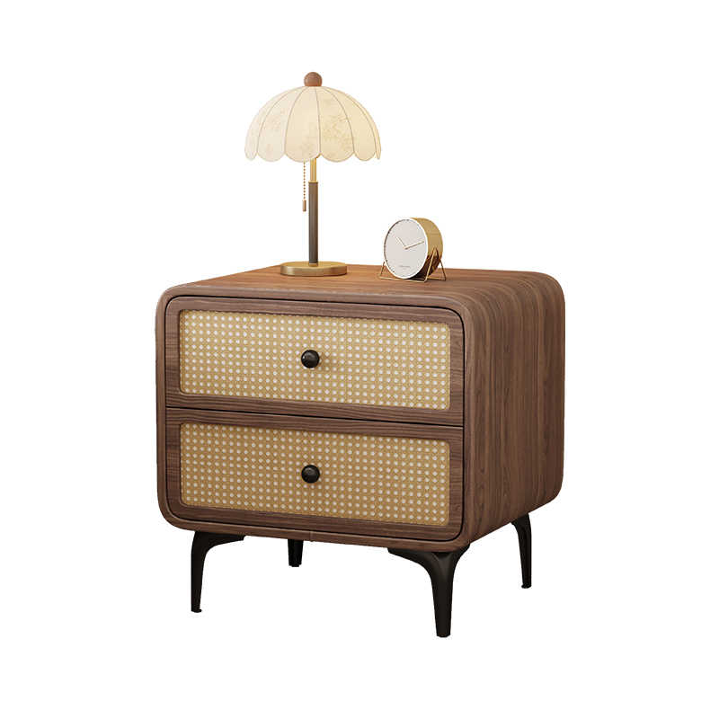 Elevate bedroom design with this Mid-Century Modern Rattan Nightstand, where timeless craftsmanship meets contemporary functionality in a stunning bedside storage solution. Measuring 15.7 inches deep, 19.7 inches wide, and 19.7 inches tall, this beautifully proportioned piece showcases authentic rattan cane webbing in a traditional basket-weave pattern that adds natural texture and visual warmth to modern interiors. The solid wood construction features rich walnut tones that highlight natural grain patterns while providing the structural integrity expected from premium bedroom furniture. Contemporary design elements include gracefully rounded corners, clean geometric lines, and an elevated profile supported by sleek black metal legs that create visual lightness while maintaining stability. Two generously sized drawers offer practical organization for books, electronics, personal items, and bedside necessities, while precision hardware ensures smooth, quiet operation for peaceful bedroom environments. Perfect for discerning homeowners, luxury hotels, or any space seeking 2025's trending combination of natural materials, mid-century styling, and Scandinavian minimalism in sophisticated bedroom furniture.