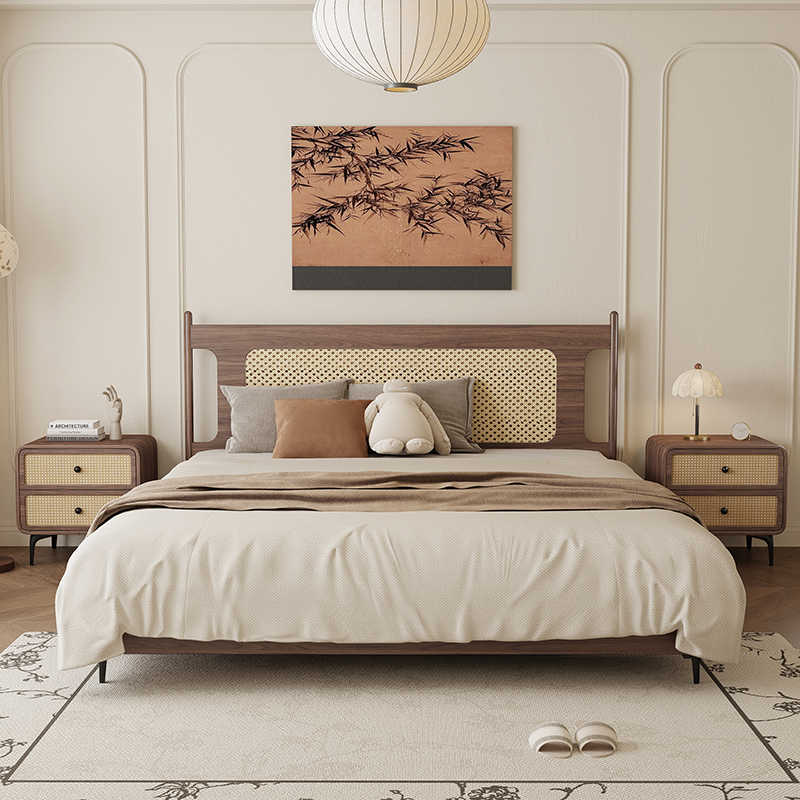 Mid-Century Modern Rattan Nightstand – Solid Wood & Woven Cane Two-Drawer Bedside Cabinet, Contemporary Scandinavian Bedroom Storage Furniture
