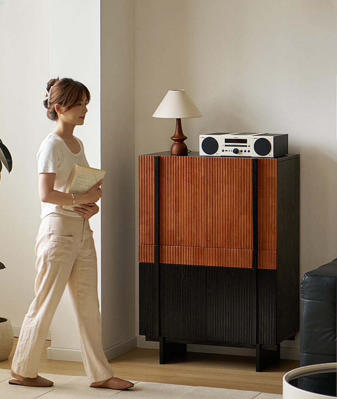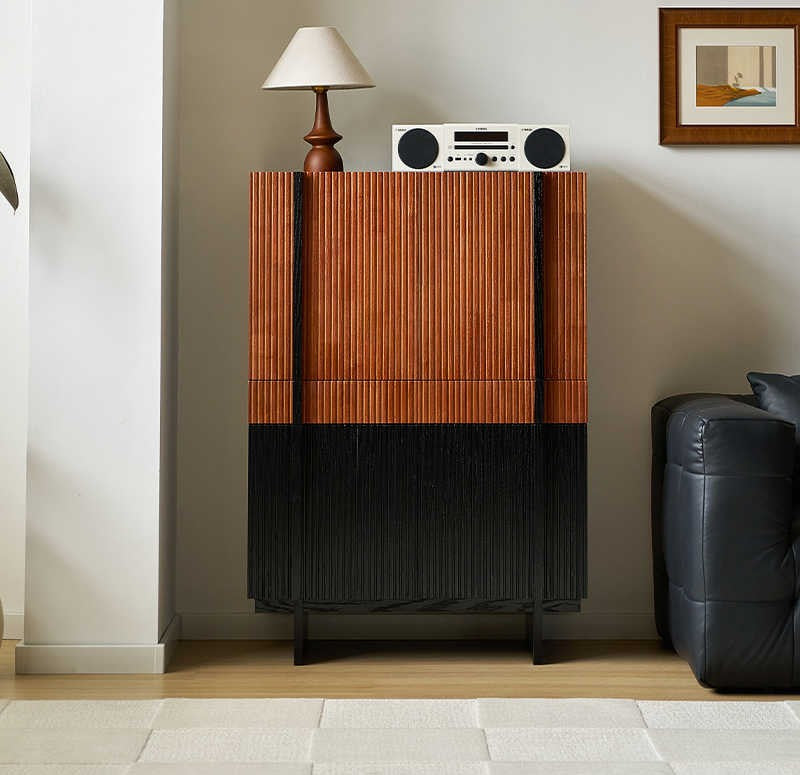This design features distinctive vertical ribbed slat surfaces, adding visual impact and texture suitable for bedrooms, living rooms, or as a welcoming foyer/entry organizer. Adjustable shelves and a ventilated rear panel allow for flexible use as media, liquor cabinet, wardrobe, or display unit. The striking combination of contrasting wood tones brings warmth and structure—matching a wide range of modern and transitional interiors.