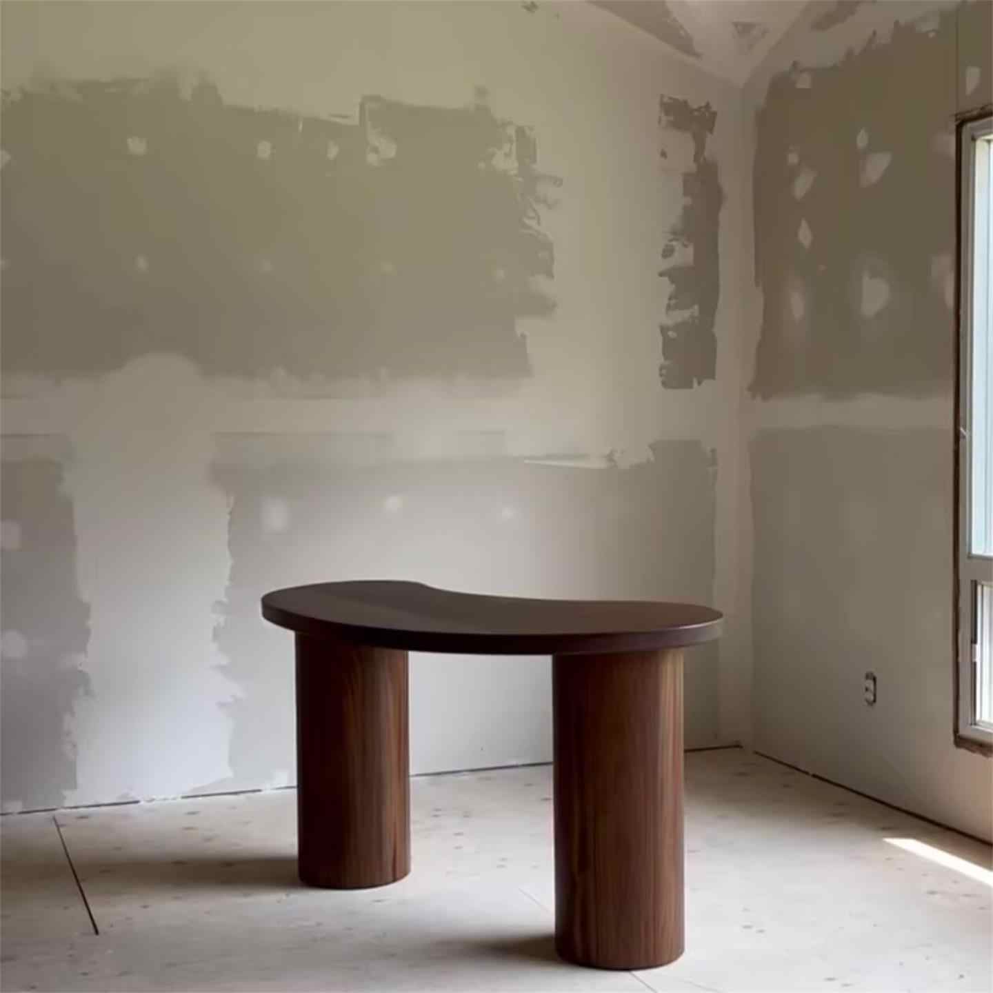 Distinctive kidney-shaped writing desk crafted from solid walnut wood, blending organic mid-century style with contemporary minimalist lines.