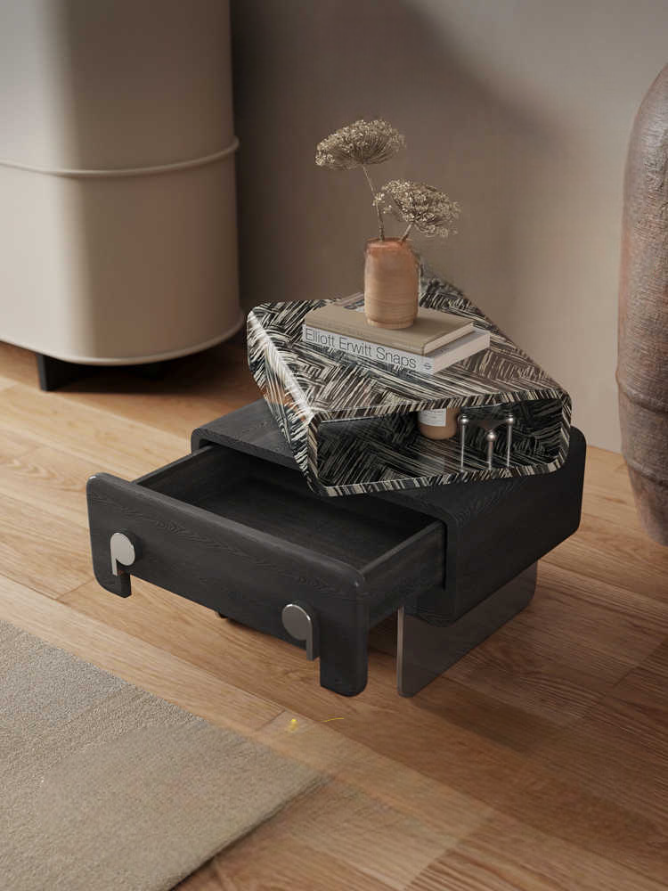 Statement bedside cabinet crafted in premium black-stained ash wood with sculptural designer silhouette.