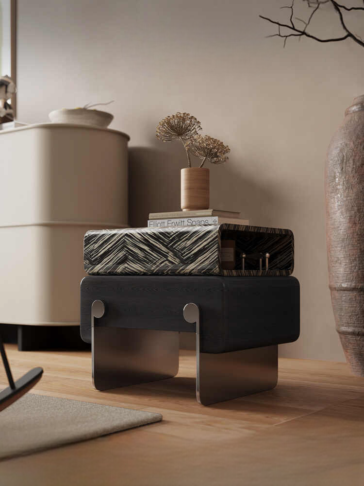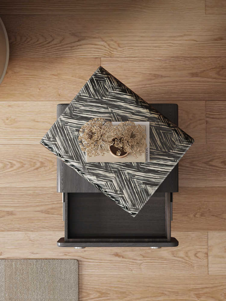 Perfect for users who appreciate designer originality, high-end wood finishes, and multi-use furniture for sophisticated, art-forward home environments.This is a designer Italian minimalist bedside cabinet in matte black ash wood, featuring a unique rotating top and sleek architectural stainless steel legs. Its compact structure (46cm long x 50cm wide x 45cm high; top tier height 13cm, middle 20cm, base 12cm; base depth 40cm) makes it ideal for modern bedrooms, as it easily fits beside your bed or sofa.