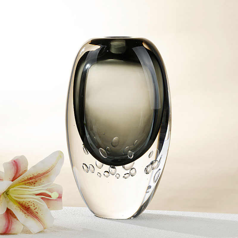 Elegant grey bubble glass vase featuring captivating air bubble inclusions that create mesmerizing optical effects and light refraction.