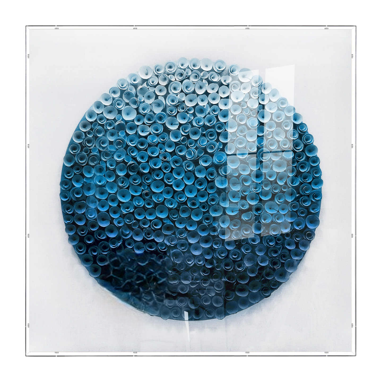 This modern abstract wall art blends luxury craftsmanship with cutting-edge design—a 3D sculpture of blue wooden florets forms a stunning circular motif, set against a clean white backdrop and encased within a crystal-clear acrylic box frame. Measuring 35 by 35 inches, the panel draws immediate attention, whether featured in an entryway, showcased over a sofa, or accenting a high-end designer hallway. Its layered wood textures and gradient coloring radiate elegance and modern style, making it the perfect upgrade for both residential and commercial environments.