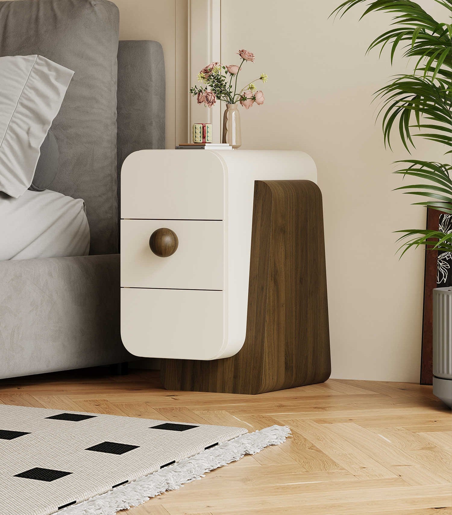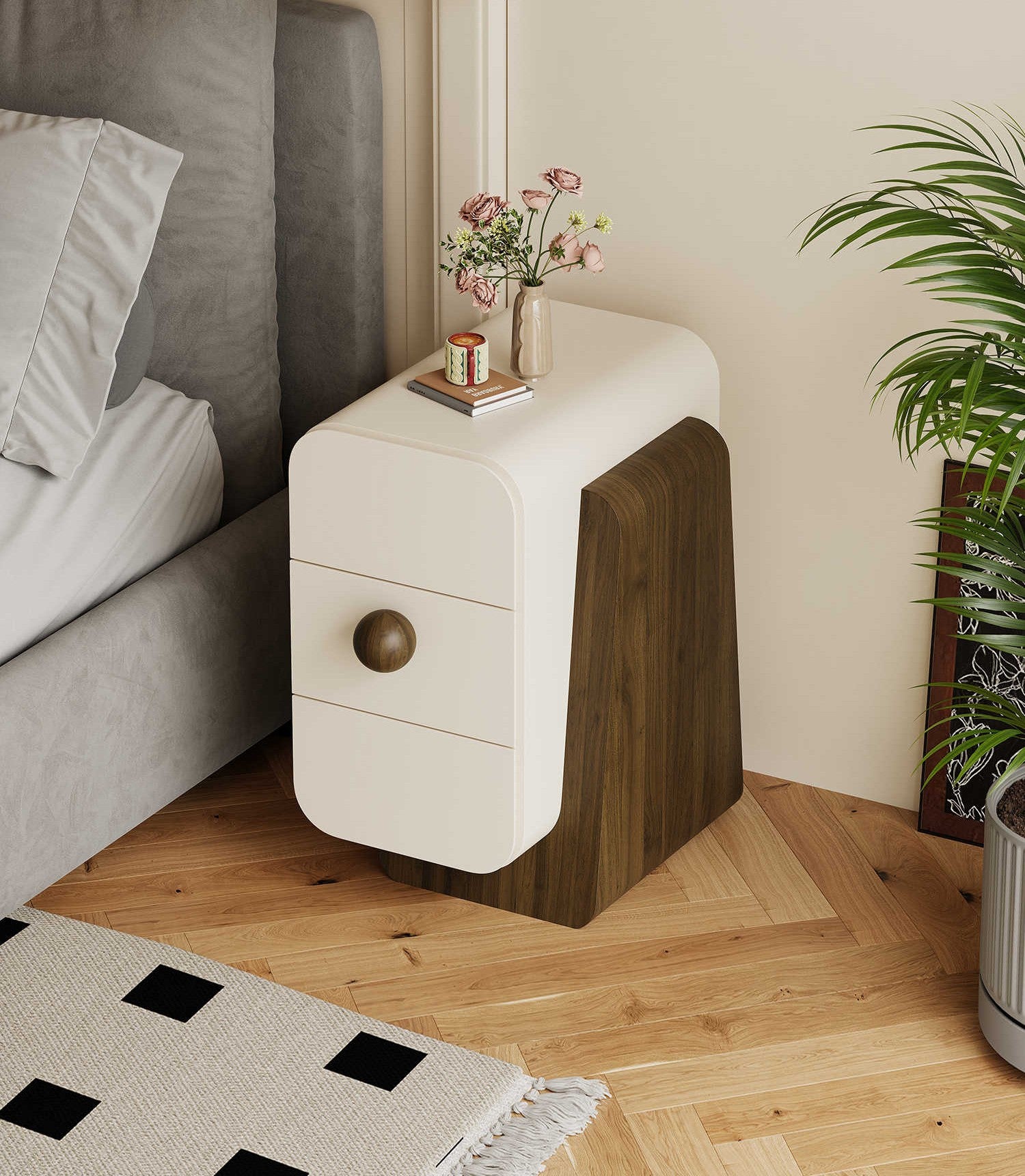 The innovative design combines form and function seamlessly, with the warm walnut base contrasting beautifully against the clean white drawer front. This thoughtful color blocking creates visual interest while maintaining the minimalist aesthetic that defines contemporary bedroom design.