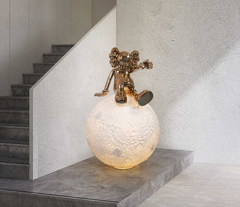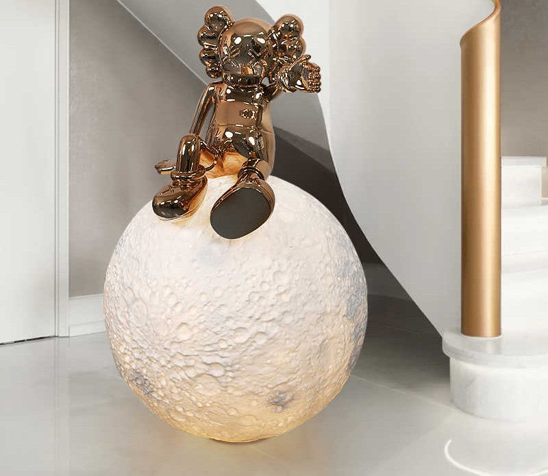 Unique designer bear sculpture features glossy finish and playful form sitting atop a moon-inspired LED lamp for standout ambiance in living rooms, staircases, or children’s rooms.