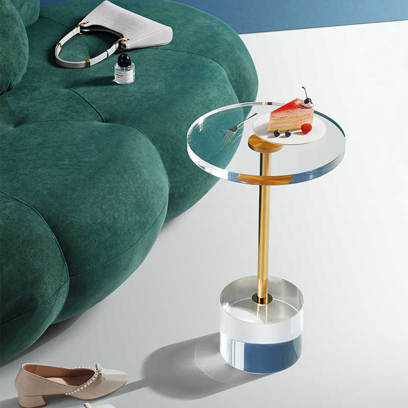 Enhance any home or office with this modern gold acrylic side table, featuring a flawless clear round top, sturdy gold-plated steel support, and a solid acrylic base for maximum stability and visual impact. Designed with minimalist and luxury décor trends in mind, the transparent body allows light to pass through, creating a chic, open feel—even in compact living spaces.