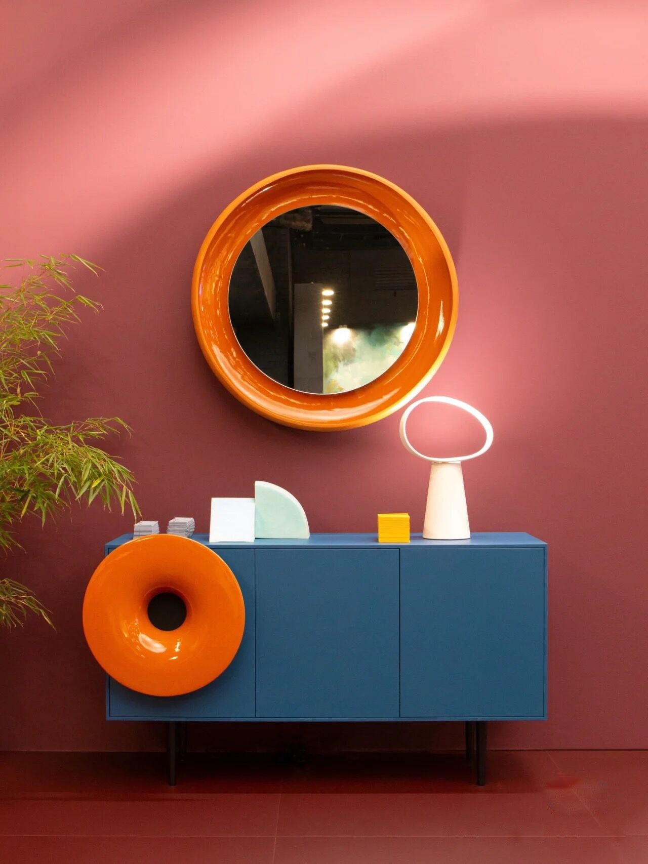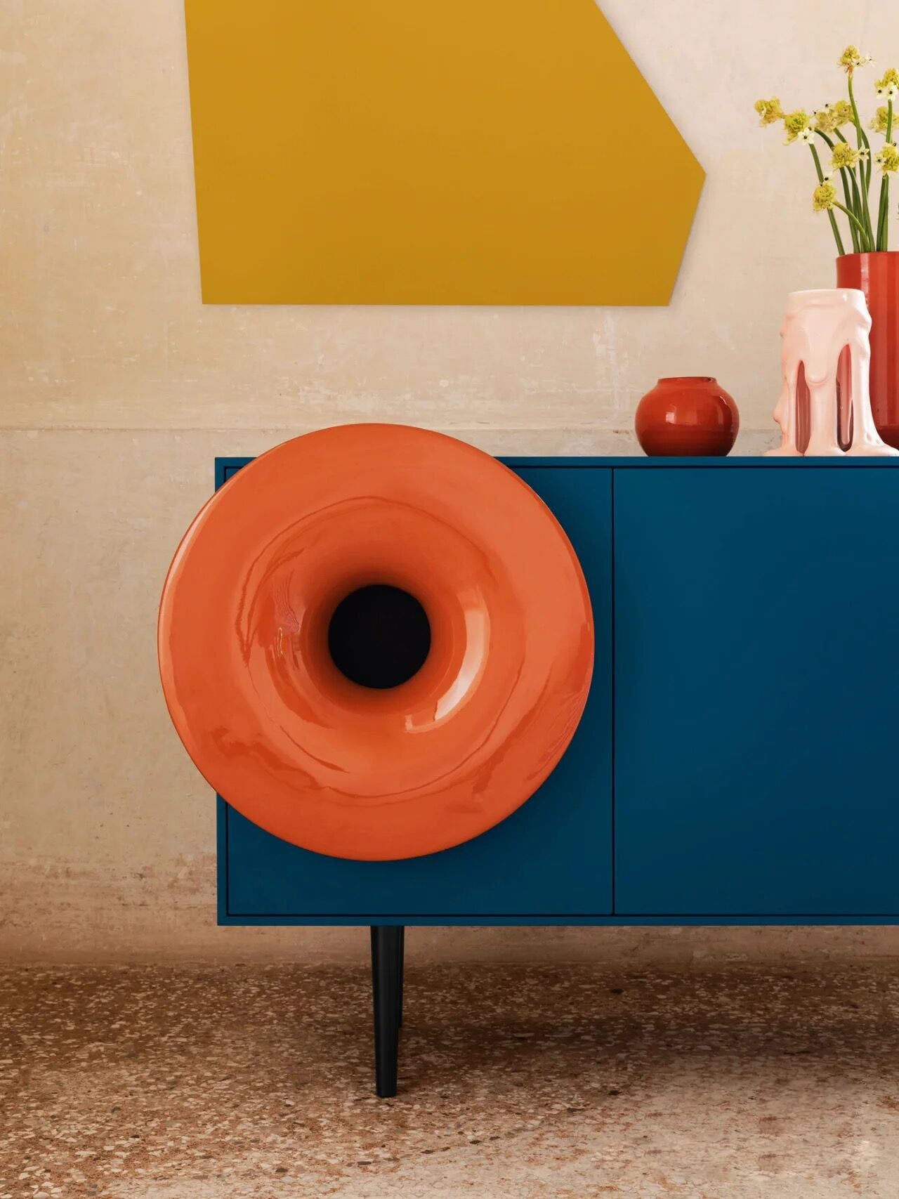Distinctive Circular Accent: Eye-catching orange disc design element creates striking visual focal point while adding artistic sculptural dimension to functional storage furniture.