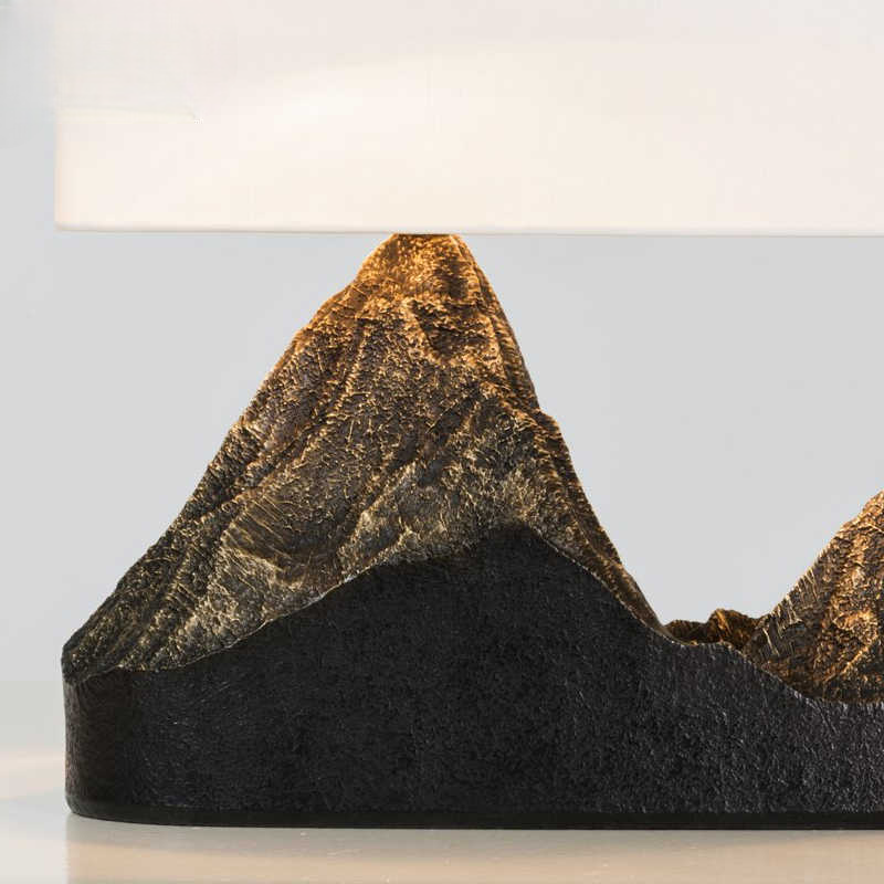 Artistic landscape-inspired table lamp with sculpted mountain base and premium fabric shade for a striking decorative statement.