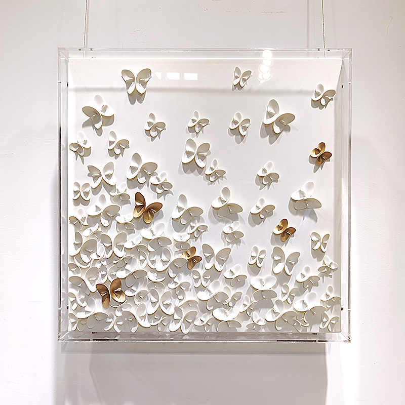 High-end 3D wall art panel featuring dozens of delicately hand-shaped white leather butterflies, accented with shimmering gold butterflies for a touch of luxury and movement.