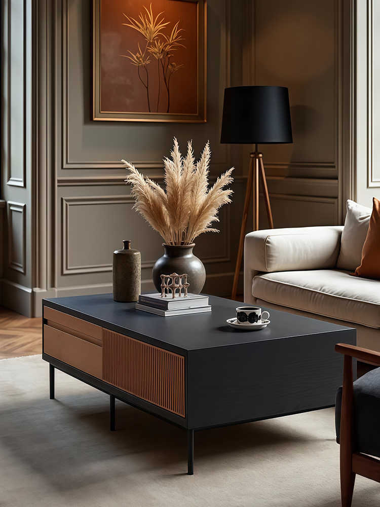 Upgrade a living room or lounge with this modern minimalist coffee table, blending timeless wabi-sabi sensibilities and vintage refinement. The solid wood construction and artful fluted drawer fronts combine for an elegant look and practical storage, keeping everyday items neatly organized. Its spacious tabletop showcases books, trays, or decadent treats, while the sturdy metal legs add a touch of industrial flair. Ideal for apartments, urban lofts, or high-end homes, this tea table coordinates seamlessly with contemporary or retro sofas and accent pieces.