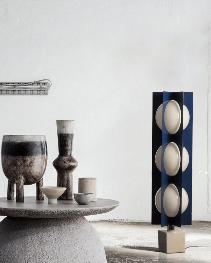 Elevate your home with this modern postmodern-inspired Stilux three-globe floor lamp. A column of soft white glass spheres, framed by a vertical metallic structure and anchored by a luxurious marble base, creates a distinctive visual statement for upscale interiors.