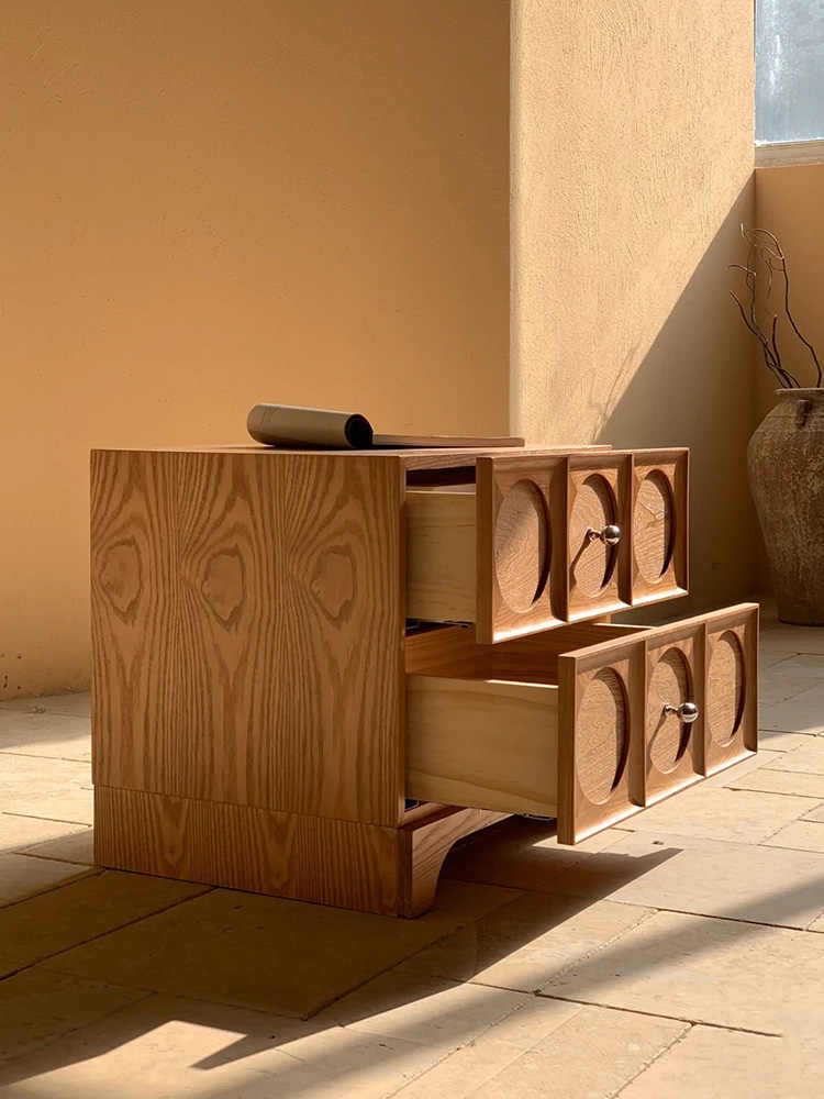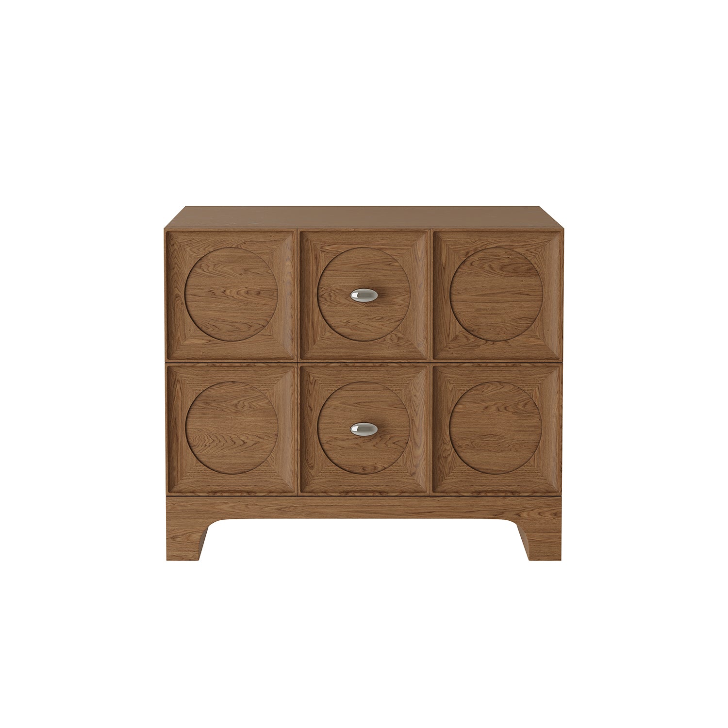 Iconic six-drawer design with circular carved fronts adds a modern-retro statement, blending geometric accents and subtle luxury.