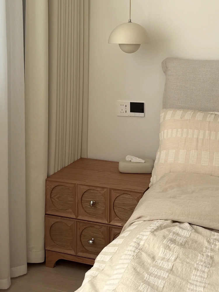 This elegant retro bedside storage cabinet features a distinctive six-drawer grid with deep circle motif fronts and polished metal handles. Measuring 54.1cm wide, 45cm deep, and 47cm high, it offers generous storage in apartments and small homes. The light coffee color creates a fresh yet timeless look, and solid wood construction ensures durability. Ideal for organizing bedroom clutter, books, or daily items while adding a sense of boutique luxury to any modern or contemporary interior.
