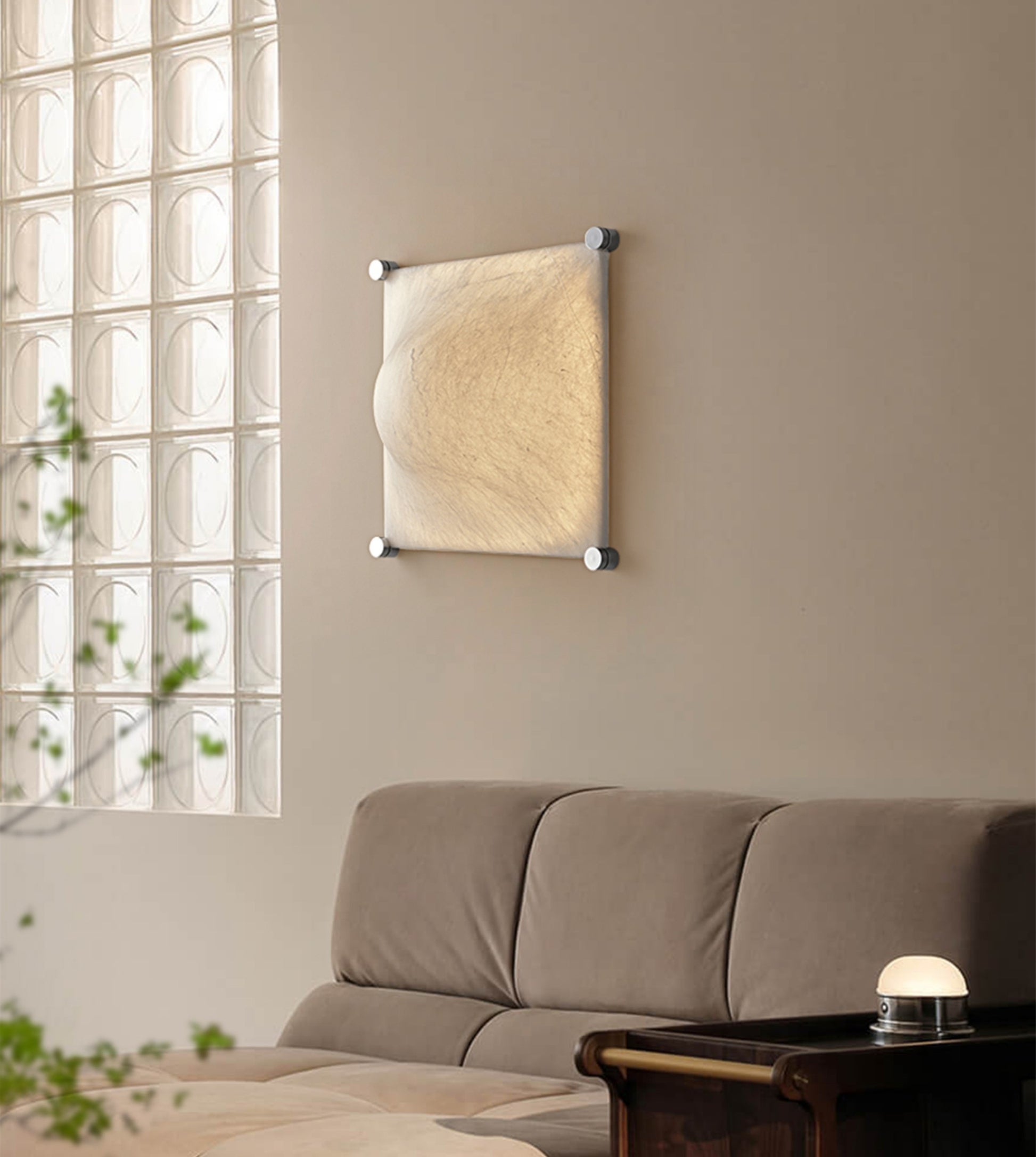 Designer wall sconce featuring a genuine mulberry silk shade and durable metal frame for modern, artistic ambiance.