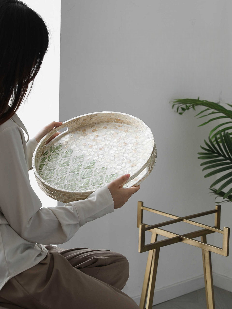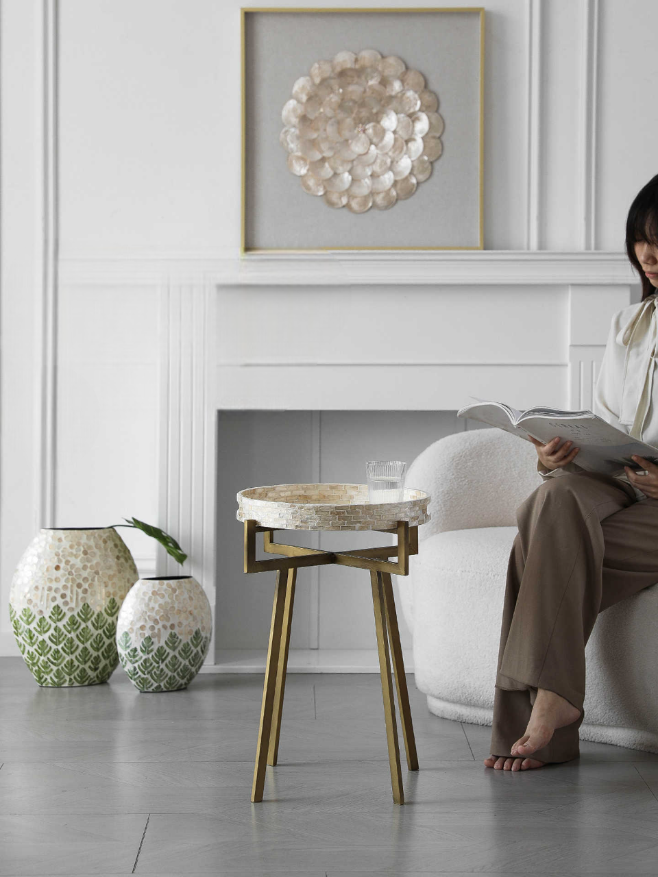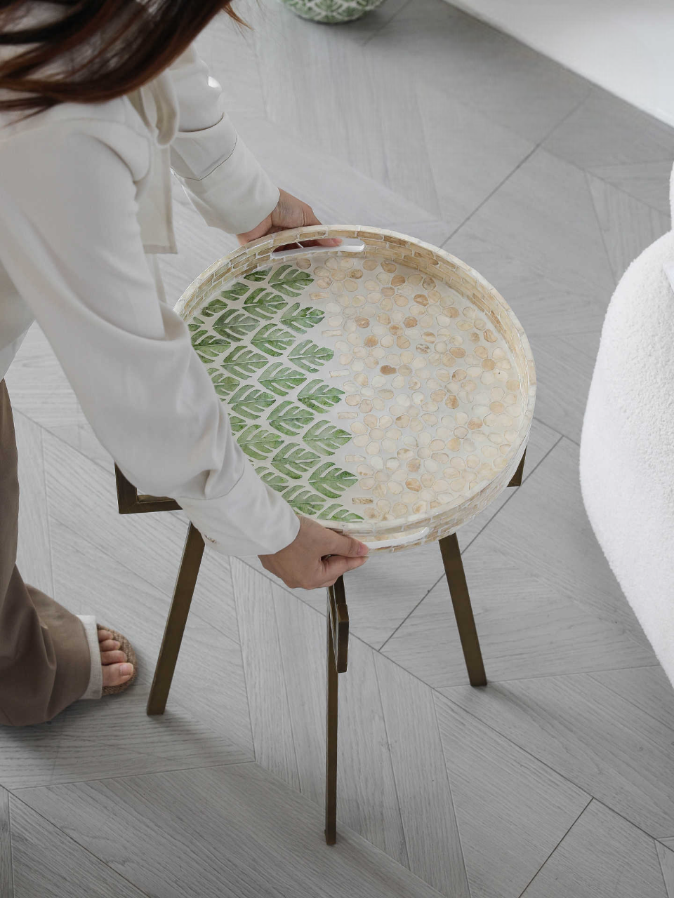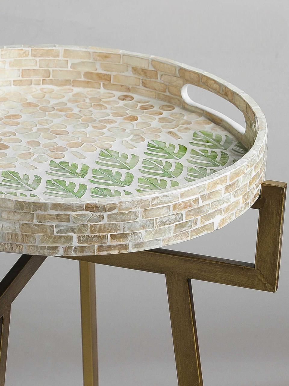 Artistic side table features a natural mosaic tray with delicate green leaf inlay and gold metal stand.