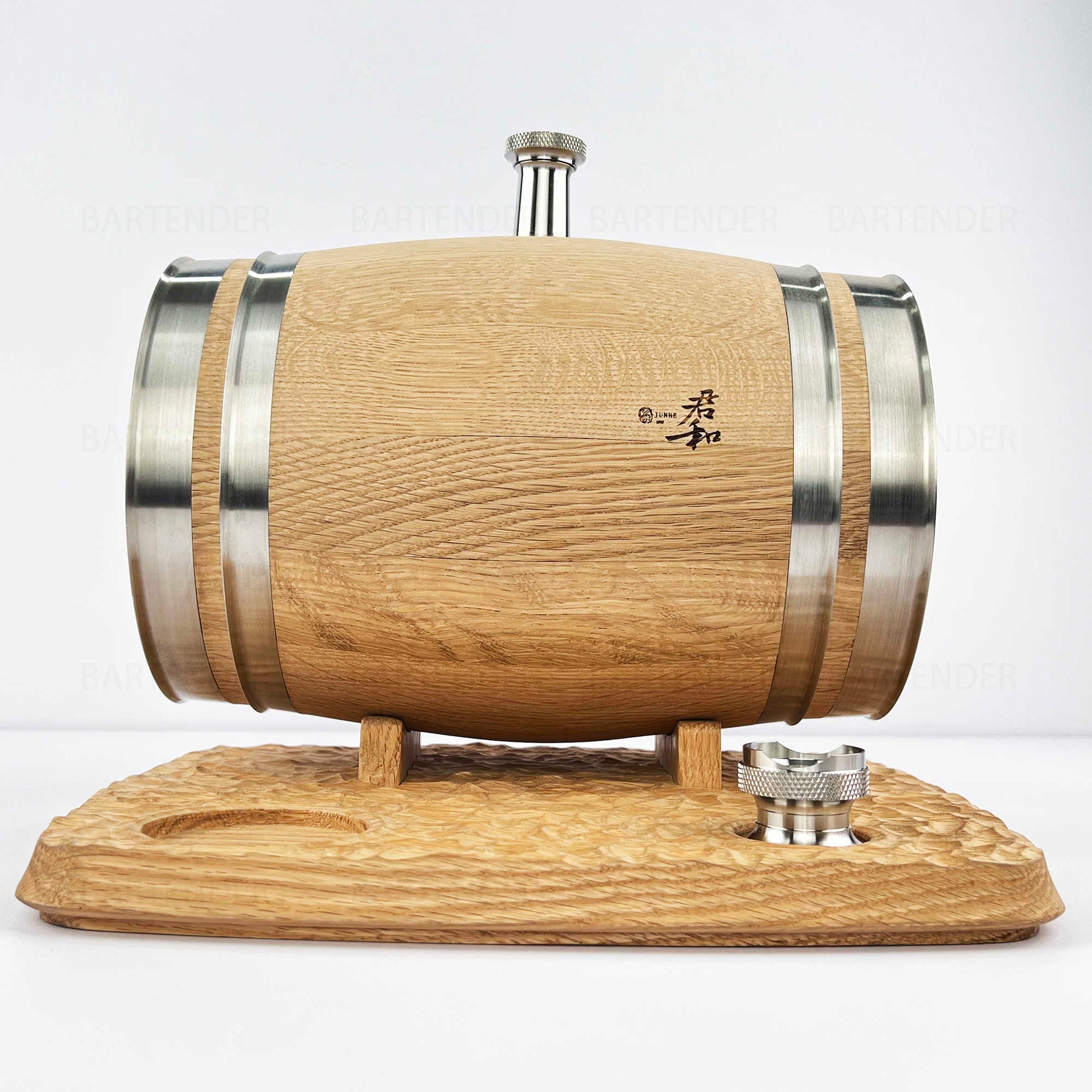Supported by a sturdy wooden stand, it balances form and function for both practical spirit aging and exquisite display.