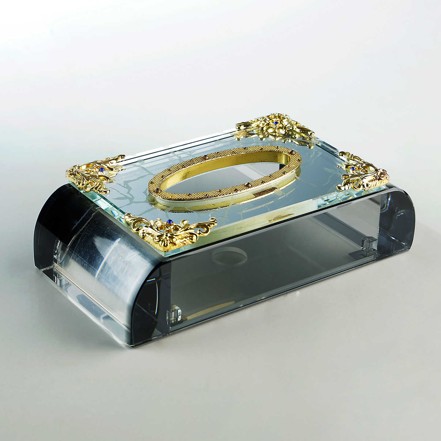 Sophisticated smoke-tinted glass with ornate metallic accents transforms everyday tissue storage into decorative art piece.