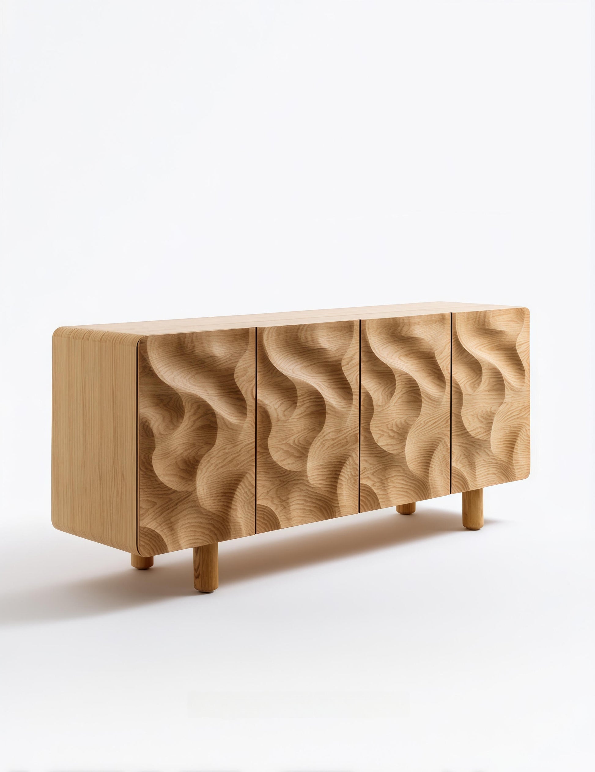 Retro Sculpted Wood Sideboard – Designer Solid Wood Wave-Carved Buffet for Modern Dining, Artistic Storage Cabinet