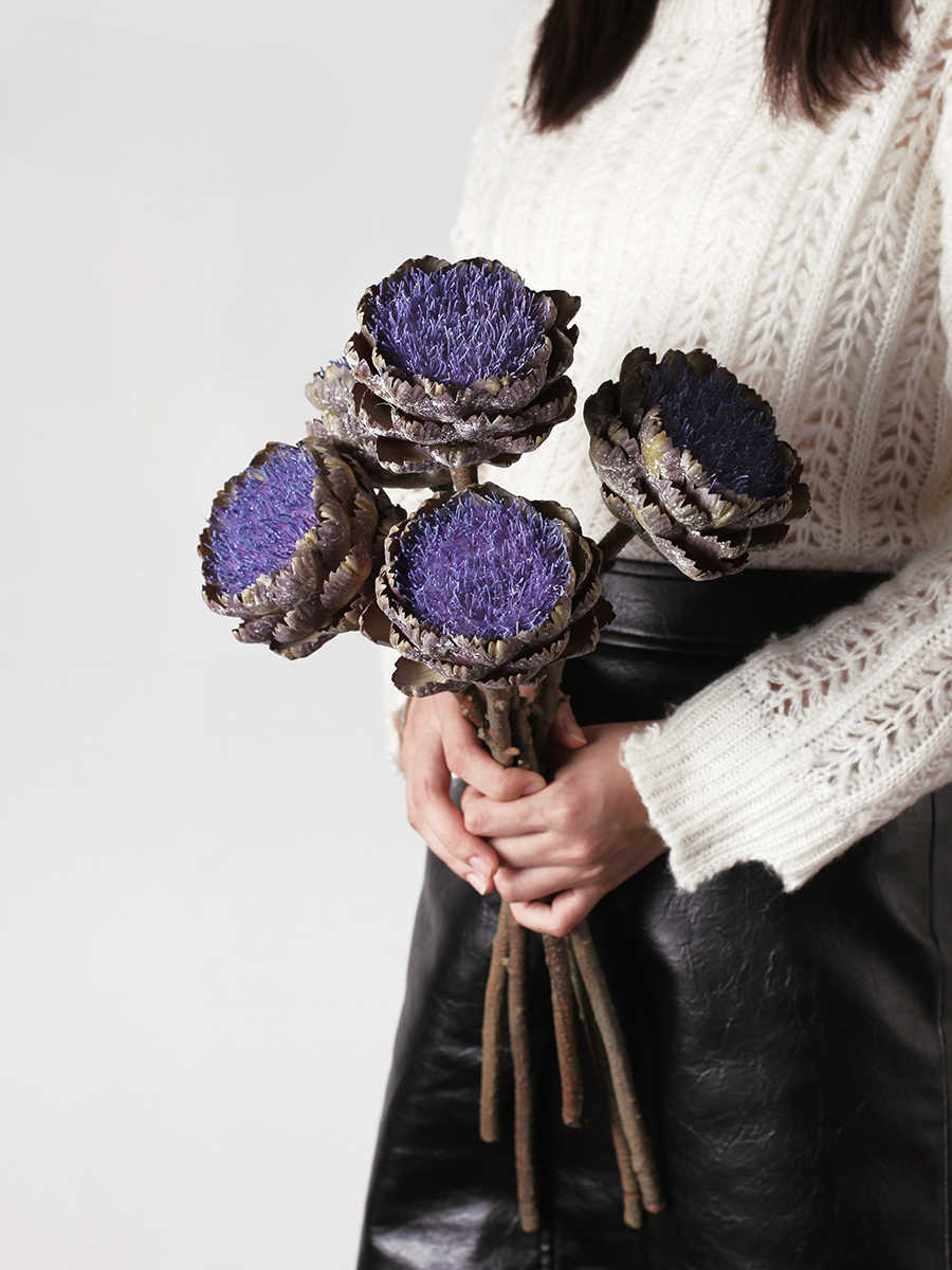 Retro-inspired single artichoke artificial flower stem brings unique sophistication to dining tables, living rooms, or boutique venues—each stem stands 48cm tall with a 10.5cm-diameter purple bloom.