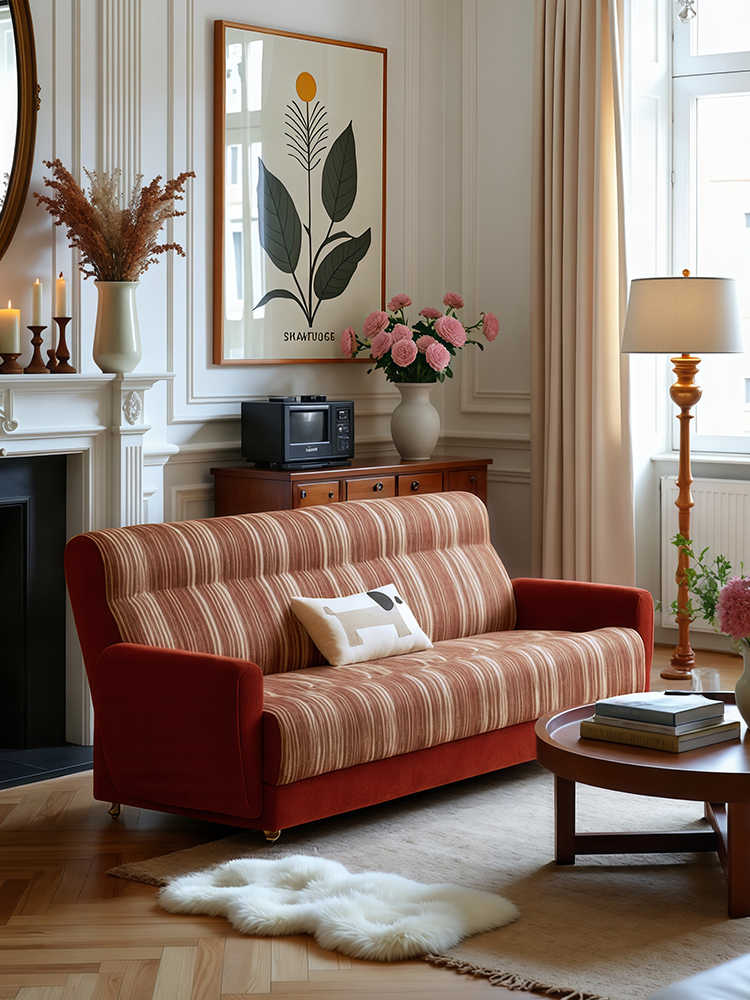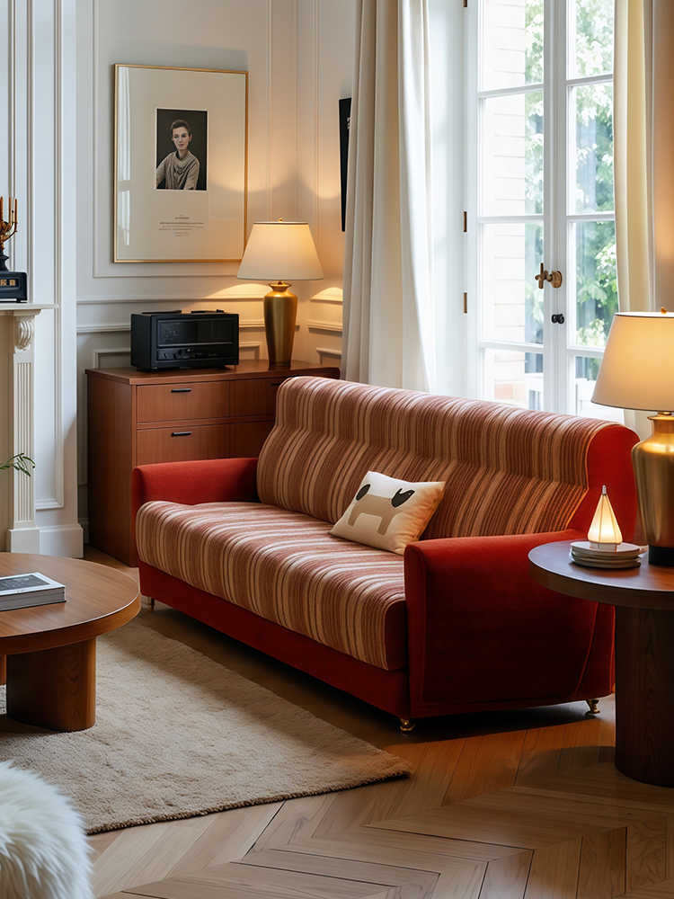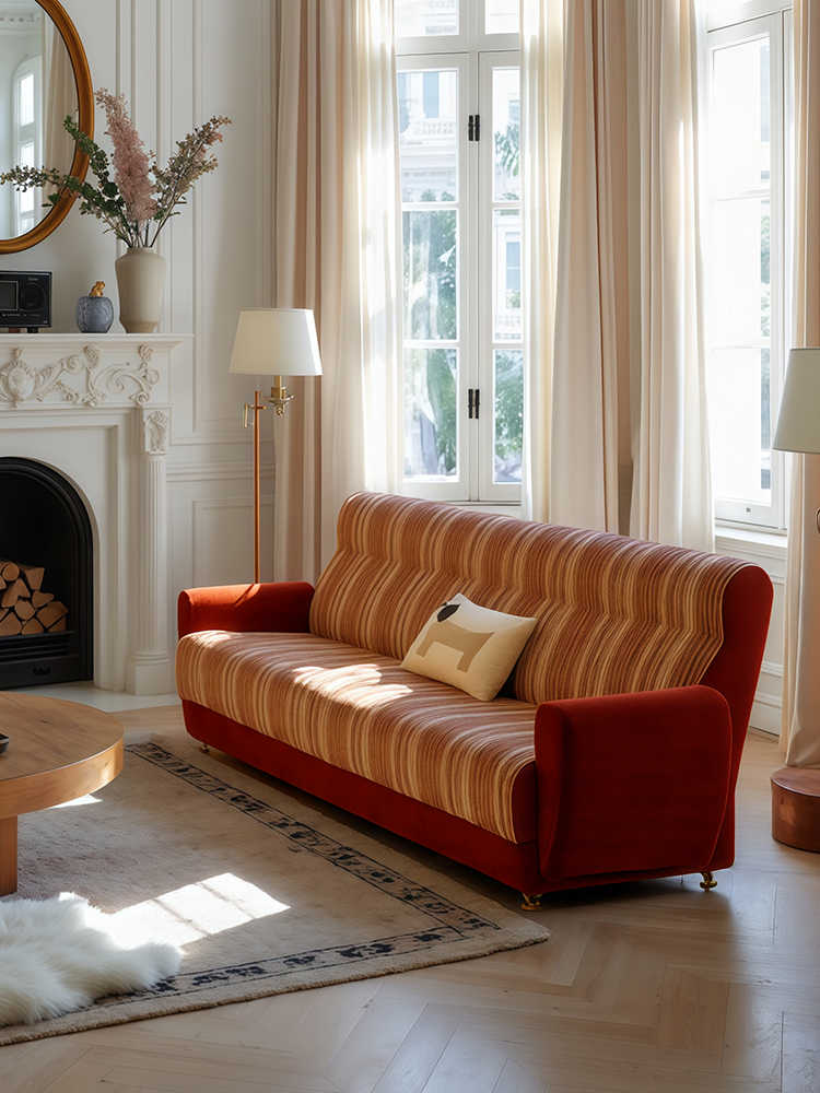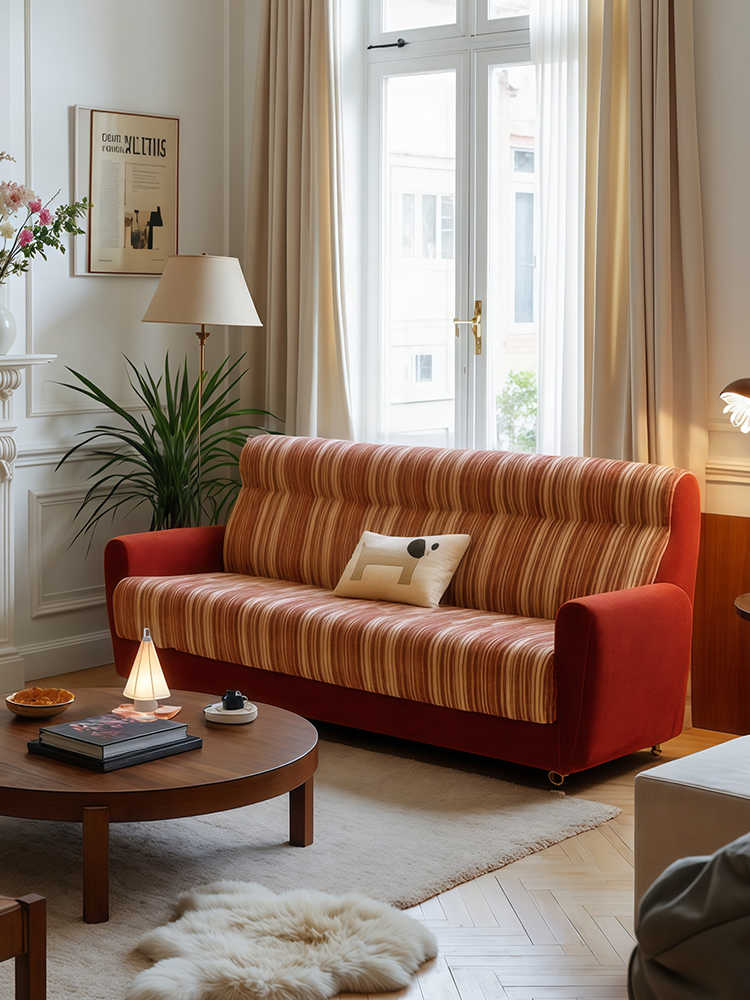 Enhance any space with this retro designer sofa, upholstered in plush striped chenille velvet for a premium look and touch. The sculpted lines, rounded arms, and deep seat combine style and comfort, fitting seamlessly into living rooms, homestays, or creative studios. Sturdy wood construction and washable covers ensure easy maintenance, while soft chenille delivers all-day luxury.
