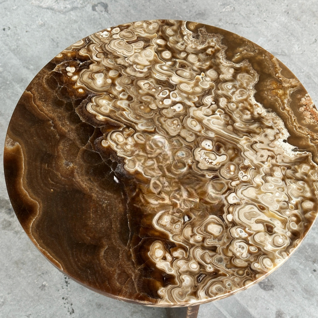 Handcrafted pedestal side table in luxurious retro brown natural marble, each piece showcasing dramatic color and unique veining.