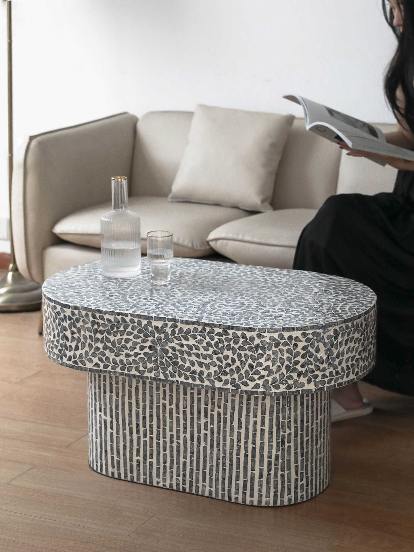 Vintage Gray Oval Coffee Table, Designer Statement Living Room Center Table for Sofa, Modern Shell Inlay Accent