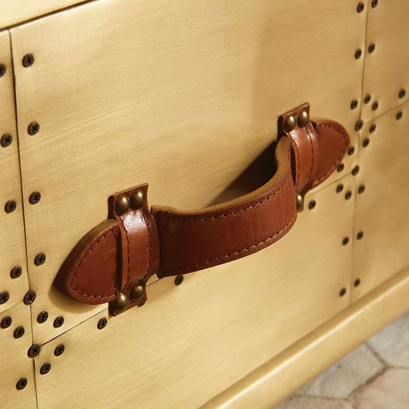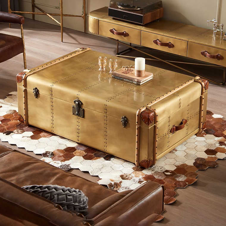 Transform living spaces with this Vintage Industrial Aluminum & Leather Trunk Coffee Table, expertly crafted to blend rugged industrial charm with sophisticated functionality. The aluminum body showcases an antique bronze patina finish, complemented by rich leather corner reinforcements and authentic metal hardware that captures the essence of vintage travel trunks. Measuring 27.6 inches deep by 51.2 inches wide and 17.7 inches tall, the generous interior storage keeps living rooms organized while the sturdy flat top serves perfectly as a coffee table, footrest, or additional seating. Quality metal latches and leather handles ensure secure closure and easy access to stored items, while the distinctive riveted construction adds authentic industrial character. Ideal for LOFT-style apartments, rustic modern homes, or any space seeking a bold focal point that combines vintage appeal with practical storage solutions.