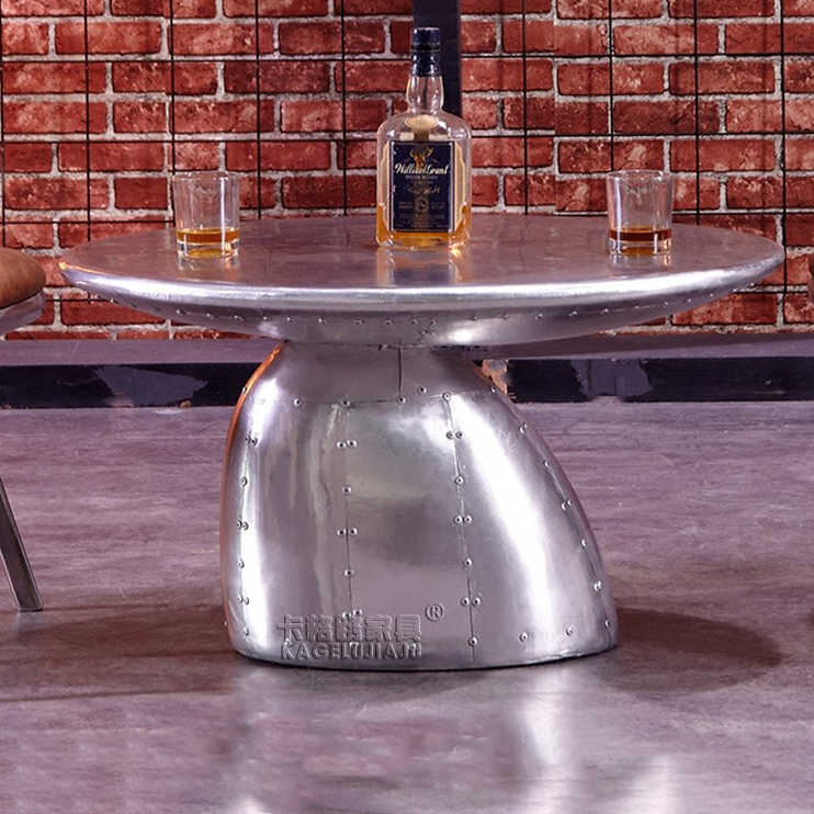 The premium aluminum construction showcases polished mirror finish with authentic rivet detailing that reflects genuine industrial manufacturing techniques. The unique sculptural base provides stable foundation while creating striking visual statement perfect for modern industrial interiors.
