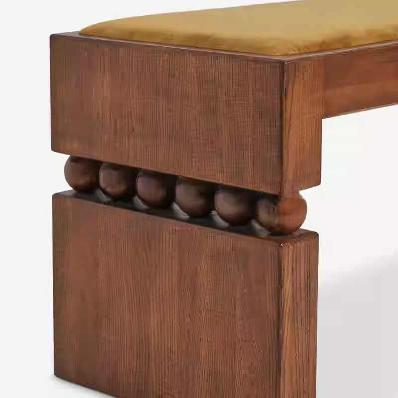 Handcrafted vintage-inspired solid wood long bench with geometric pedestal accents and plush seat cushion in mustard yellow.