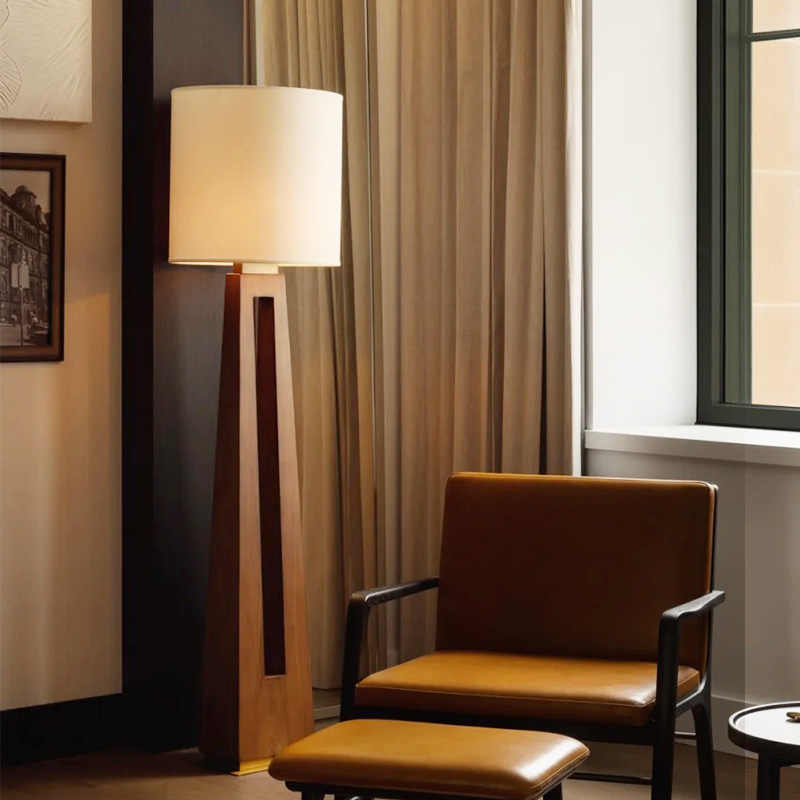 Elegant tall floor lamp crafted from solid walnut wood with a drum linen fabric shade, providing full spectrum warm light—ideal for living rooms, bedrooms, or meditative tea rooms.