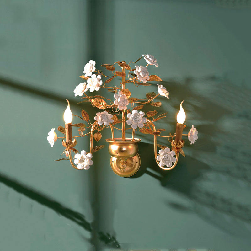 Add artistic charm and sophisticated floral style to your interiors with this modern brass wall sconce, adorned with exquisite white ceramic roses. Measuring 15.7 inches long by 18.9 inches high, this elegant fixture pairs luxurious gold-tone branches and leaves with hand-sculpted blossoms for a graceful, romantic effect. Perfect for bedrooms, hallways, entryways, or living rooms, the sconce supports efficient LED candle bulbs for a soft, inviting light. The sturdy mounted base and included hardware ensure effortless installation, while the design’s classical yet contemporary appeal makes it suitable for both upscale homes and professional decor projects. Elevate your wall decor with lasting elegance and handcrafted artistry.